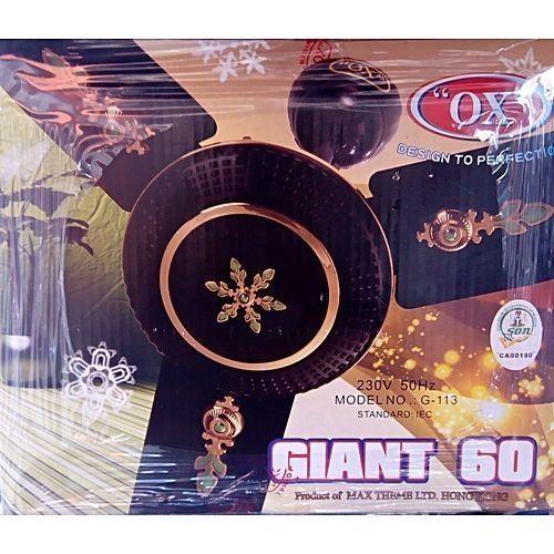Colour Brown Brand Ox Fan Speed 5 OX Plus Giant 60" ceiling fan is designed for perfection. Its a plus to durability, high speed of 5 regulating control of your choice, effective and noiseless.Its cool anytime or anywhere. The ox plus 60inch ceiling fan is both fashionable and durable. It's unique white colour and design makes it beautiful in any environment.Ox 18" plus ceiling Fan is a suitable home and office appliance for achieving a relaxed and comfortable environment. It comes with nice features to give you the best cooling experience. . Its 5 speed selector lets you have absolute control over the fan by regulating how fast the blades rotate. It has a strong rod which gives it solid stability and ensures it does not tilt. The blades of the fan are made from rust resistant material which guarantees long lasting use. The high efficient blades of the Ox Industrial Stand Fan lets you cool your body temperature in an instant. It has a silent operation so you can use it anywhere whether you are in the office working or at home trying to rest. With this ceiling fan, you get flexibility, high speed cooling and low noise operation. It can be used in any area of your home like living room, dining room and bedroom. It is made from durable materials so it will conveniently serve you for a long period of time. Turn to this ceiling fan from OX after a stressful day for maximum comfort. Detail: ceiling Fan High efficiency blades Silent and breezy Elegant Style