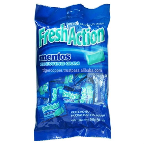 Mentos action fresh is exactly as the name implies. It leaves your breath and teeth looking and feeling fresh for hours. This particular pack holds 50 pieces of minty goodness, just enough for you to share with friends and family. Mentos Fresh candy is chewy and gummy at the same time, this way you get to enjoy every last minute. Each chew delivers an extra burst of freshness every single time. The good thing about Mentos fresh candy is that you can have it on the go, all you need to do is tear open the little nylon pack and pop it open in your mouth. It doesn't matter where and when -- might be before that big conference meeting, after eating your onions filled salad for lunch or even on a date with that special someone.Mentos Fresh candy is long lasting, just one piece can last up to an hour, giving you 60 full minutes of delightful freshness. Some of you might begin to ask if this has any health benefits whatsoever, well they do. The simple act of chewing candy accelerates the rate at which saliva is manufactured -- this is a defense mechanism for the mouth. Mouth bacteria survives by feeding off waste products that accumulate after eating. If left to settle, the organic acid that is produced as a byproduct causes a decline in the PH level of the mouth, this is very dangerous to the tooth enamel. Chewing candy helps prevent all of this by providing saliva that is rich in calcium. Calcium is very effective in providing minerals for the tooth enamel; stopping tooth decay.