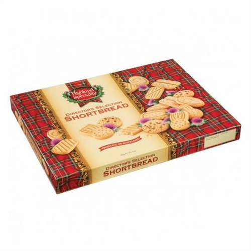 Highland Speciality Director's Selection Shortbread 1kg A large selection of tasty highland speciality shortbread biscuits. This generous 1kg box is a delicious treat for the festive season. Great for enjoying yourself and sharing amongst friends and family. A selection of Plain and Chocolate Chip Shortbread made in the heart of Scotland. Baked using only the finest natural ingredients, this delicious selection of shortbread shapes is uniquely inspired by our Scottish heritage.