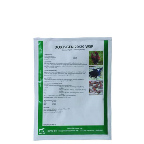 Doxycycline is a tetracycline antibiotic with bacteriostatic action against a large number of Gram-positive and Gram-negative bacteria (like Staphylococcus spp., Haemophilus influenza, E. coli, Corynebacteria, Bacillus anthracis, some Clostridium spp., Actinomyces spp., Brucella spp., Enterobacter spp., Salmonella spp., Shigella spp. and Yersinia spp.). It also acts against Mycoplasma spp., Rickettsiae and Chlamydia spp. Gentamycin is not absorbed from the gastrointestinal tract and therefore acts locally. Following oral administration, doxycycline is rapidly absorbed from the gastrointestinal tract and produces a therapeutic blood level quickly, which persists for a long period, as doxycycline has a relatively long-serum half-life. Doxycycline has a great affinity to lung tissues, therefore it is recommended especially for respiratory tract infections. This combination provides an intensive antibacterial effect in the gastrointestinal tract and a rapid and intensive systemic effect after absorption. Doxy-Gen 20/20 wsp is a potent antibacterial product and useful in most infective diseases in the targeted animals.