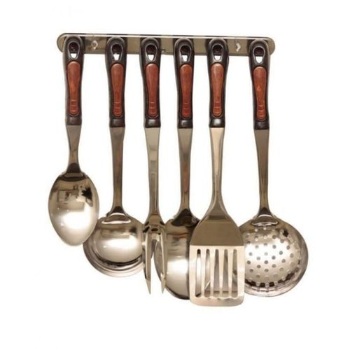 This is cooking made easy; as there are different cooking spoons for any occasion, it includes spoon for serving, frying, grilling etc. It comes with a hanger which can be fastened to the wall of your kitchen for easy storage of the spoons. The spoons are made of stainless steel, and the handles are covered with plastics so as to prevent burn from heat movement up the spoon.Six different cooking spoons:Serve spoonSkimmerSteel ForkSpatulaTurnerLaddle1 hanger