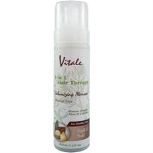 Vitale's 3-in-1 Hair Therapy Volumizing Mousse is alcohol-free and blended with three natural exotic oils: Argan Oil, Macadamia Oil and Tea Tree Oil. It helps nourish and moisturize while adding body and definition. Formulated to build volume and boost shine with soft control for any style you desire. A very unique blend of organic material to give volume, hold and strength to every woman’s hair. This gives amazing result when use on fine hair texture to medium hair texture for a perfect hold and straightness for finished hair styling. Doesn’t dry hair out or induce breakage. Perfect for roller setting, Brazilian blow out and finished hair styling