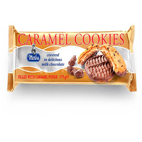 Description Merba Caramel CookiesOur Caramel Cookies are a real treat! The cookies contain pieces of chocolate and a filling of delicious caramel.When our caramel cookies are almost ready, we dip them into milk chocolate, to create that lovely chocolate bottom