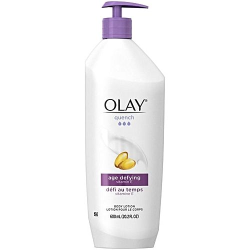 Olay Quench Age Defying Body Lotion is formulated with Olay moisturizers and vitamin E to go beyond moisturization. The body lotion formula works within skins surface layers to improve elasticity and hydrate dry areas for younger-looking skin. After just one use, youll feel 24-hour moisture to improve skin elasticity. And with continued use, skin becomes noticeably smooth, even-toned and younger-looking. Its age-defying formula combats dryness associated with the look of aging skin over time. Formulated with VitaNiacin, a combination of vitamins B3, B5 and E. Experience 24-hour moisture from Olay Skincare in this age-defying body lotion. Go ahead and quench your skin from head to toe.