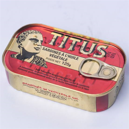 Edible and well preserved Titus sardines in vegetable oil with no preservatives. It weighs 125g per tin and has shelf-life of 5years.