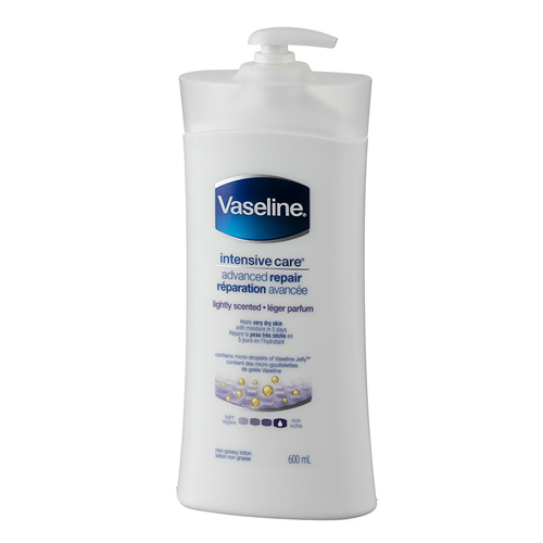 When you have very dry, rough, irritated skin you need something that will moisturize to help it heal fast. In our Vaseline Intensive Care Lotion, Advanced Repair Unscented 20.3 oz., Pack of 3, we've combined healing micro-droplets of Vaseline Jelly and our highest levels of moisturizing glycerin. The result is a rich lotion that gives you intense moisturization. This lotion deeply moisturizes to heal very dry skin in only 5 days. Suitable for Sensitive Skin Our Advanced Repair, Unscented lotion isn't just your average moisturizer. Clinically proven to heal dry skin in 5 days, it provides prescription strength moisturization without the prescription to restore soft, healthy looking skin. It's also been awarded the U.S. National Eczema Association (NEA) Seal of Acceptance. Lotions for eczema related dryness and for sensitive skin need to be gentle on the skin yet contain nourishing ingredients to effectively tackle the issue of dryness head on. With its seal of approval from the NEA, Vaseline Intensive Care Advanced Repair Unscented Lotion is suitable to use as a daily moisturizer for people with eczema or sensitive skin. Fast-healing Moisture Vaseline Intensive Care Lotion, Advanced Repair Unscented 20.3 oz., Pack of 3 helps to relieve dry skin from the first application. It contains micro-droplets of Vaseline Jelly, which penetrate deep down to form a protective layer on your skin and lock in moisture. This sealing barrier speeds up the skin's natural barrier recovery. Advanced Repair lotion also contains glycerin and simethicone, which draw moisture to the skin to rehydrate very dry skin.