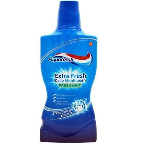 Aquafresh – Extra Fresh Daily Mouthwash 500Ml Actively freshens breath Alcohol free Helps prevent plaque build up Strengthens enamel Aquafresh Extra Fresh Daily Mouthwash is an antibacterial formulation which helps fight plaque build up on your teeth, for a clean and healthy mouth. Contains an active mineral which binds to and strengthens your tooth enamel Helps reduced the build up of plaque to help maintain healthy teeth and gumsKills bacteria that can cause bad breath, leaving your breath fresh.