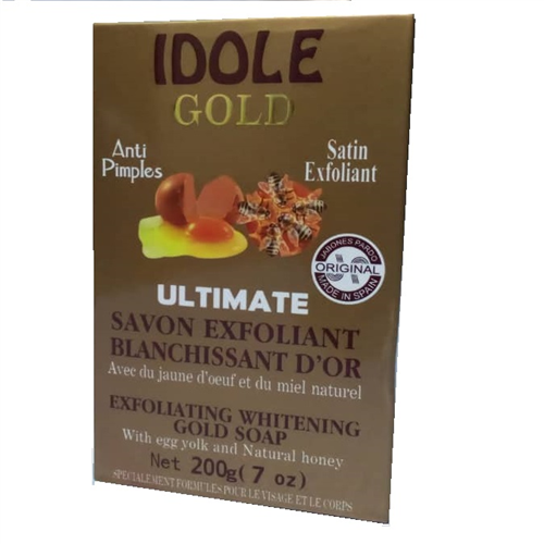 Idole Gold Soap 200g contains Anti Pimples with egg yolk and natural honey. It's rubbing action deeply cleans the epidermis, lightens your complexion and leaves your skin smooth, even and radiant.It extracts helps this exfoliating and cleaning action. For every skin type.