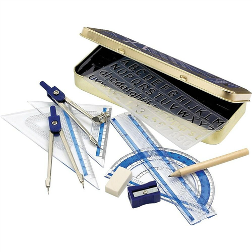 The perfect maths set for students studying a range of subjects including maths, geometry, trigonometry and design technology. The set includes a 9cm Pencil, 15cm /6" rule, a Stencil, Metal Self-centring compass, 180 degree protractor, set squares, timetable/fact sheet , sharpener and eraser all presented neatly in a metal storage tin